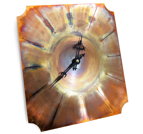 The clock face was made by flame painting/heat treating Copper. Depending on surface treatments prior to applying heat, length, intensity and pattern of flame, and how it's quenched, some amazing patterns and colours can be drawn out of Copper. It's like "painting with a flame". The clock has been sealed with a crystal clear glaze.